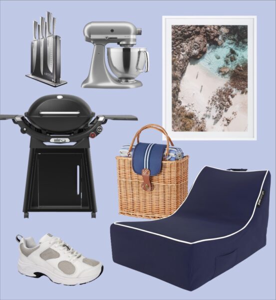 Bed Bath N’ Table Morgan & Finch Atticus Wicker Picnic Cooler $99.95, Freedom Morning In Paradise Framed Print $299, Gilmour’s Comfort Shoes Drew Flash II Sneaker $379, House Baccarat Damashiro Kin Knife Block $849.99, House KitchenAid KSM195 Artisan Stand Mixer $749.99, Outdoor Living Weber Family Q+ Premium BBQ $899, The Furniture Shack Kirra Indoor Outdoor Bean Bag $269.